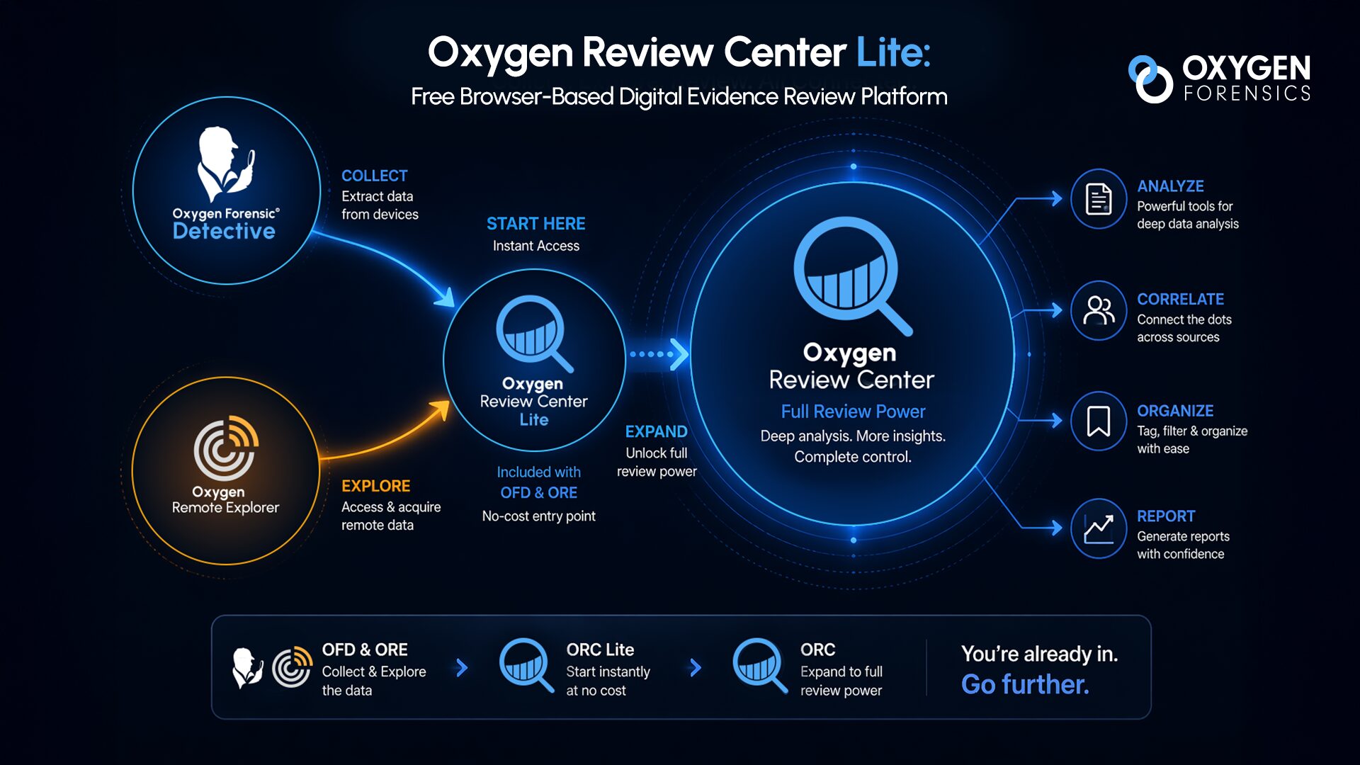 Firma Oxygen Forensics představila platformu Oxygen Review Center Lite, která umožňuje vyšetřovacím týmům spolupracovat na analýze digitálních důkazů přímo prostřednictvím webového prohlížeče. Jde o lehčí a rychlejší alternativu k plné verzi Oxygen Review Center, která je navíc pro uživatele Oxygen Forensic Detective dostupná zdarma.